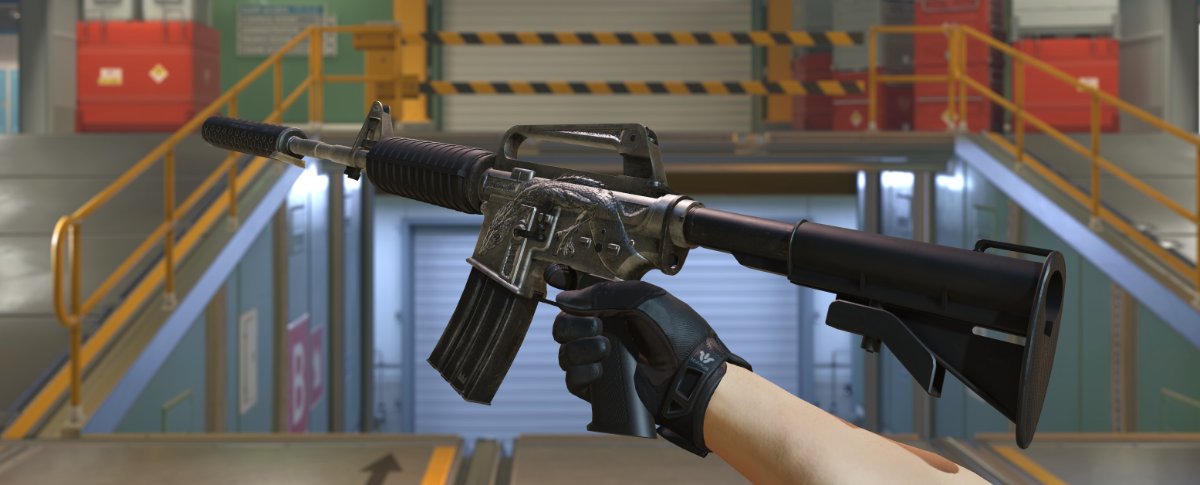 The M4A1-S | Basilisk skin introduces a hint of mythical menace to the dark theme. It features a primarily dark gray base with an artistic depiction of a coiled basilisk serpent near the magazine.