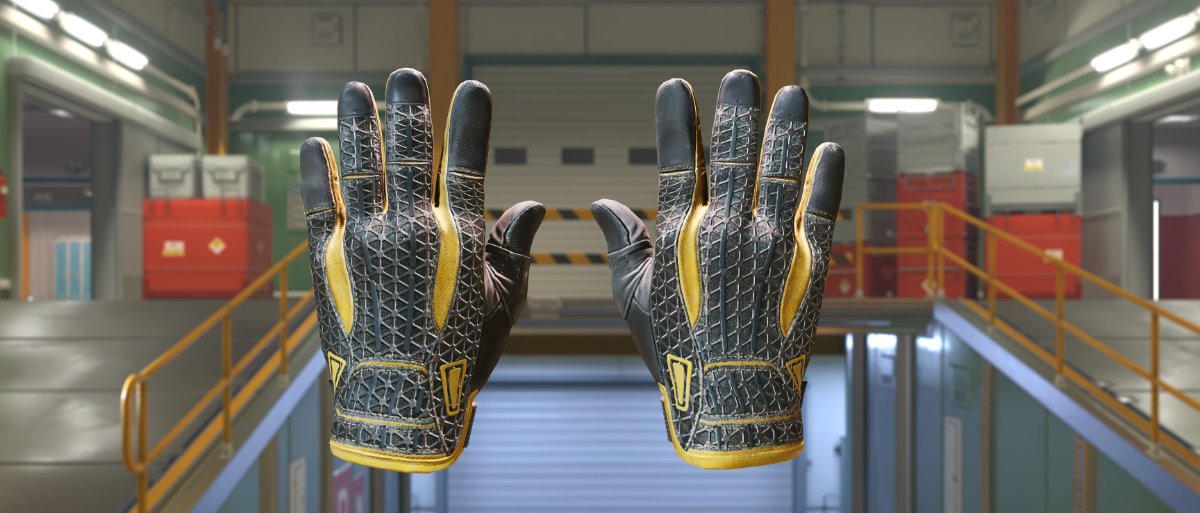These gloves establish a sleek, modern foundation with a digital-camouflage aesthetic. The pattern features interlocking hexagons and geometric shapes in shades of yellow, black, and gray, offering a tactical yet vibrant look. As glove skins from the Spectre Case, they occupy a high rarity tier with a very low drop rate.
